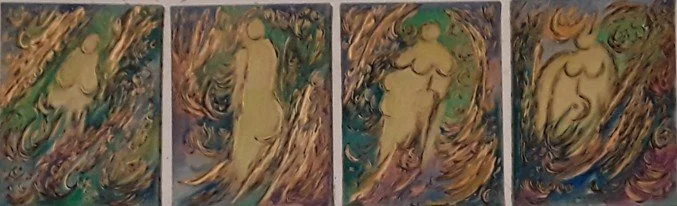 Alain Pouillet, Concile d’amour, 1988, Huile, or, argent, et cuivre sur toile, 29x37cm chaque