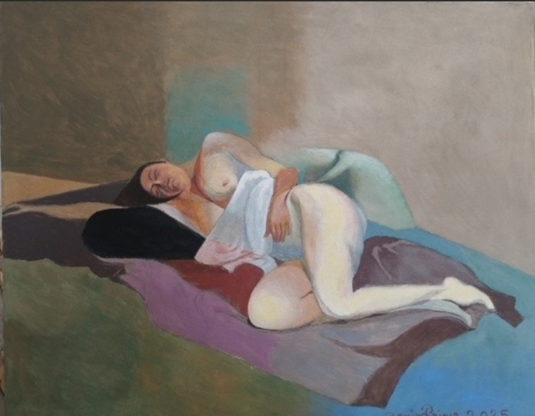 Denis Prieur, femme allongée endormie, 2025, tempera, encaustique et huile sur toile, 80 × 65 cm