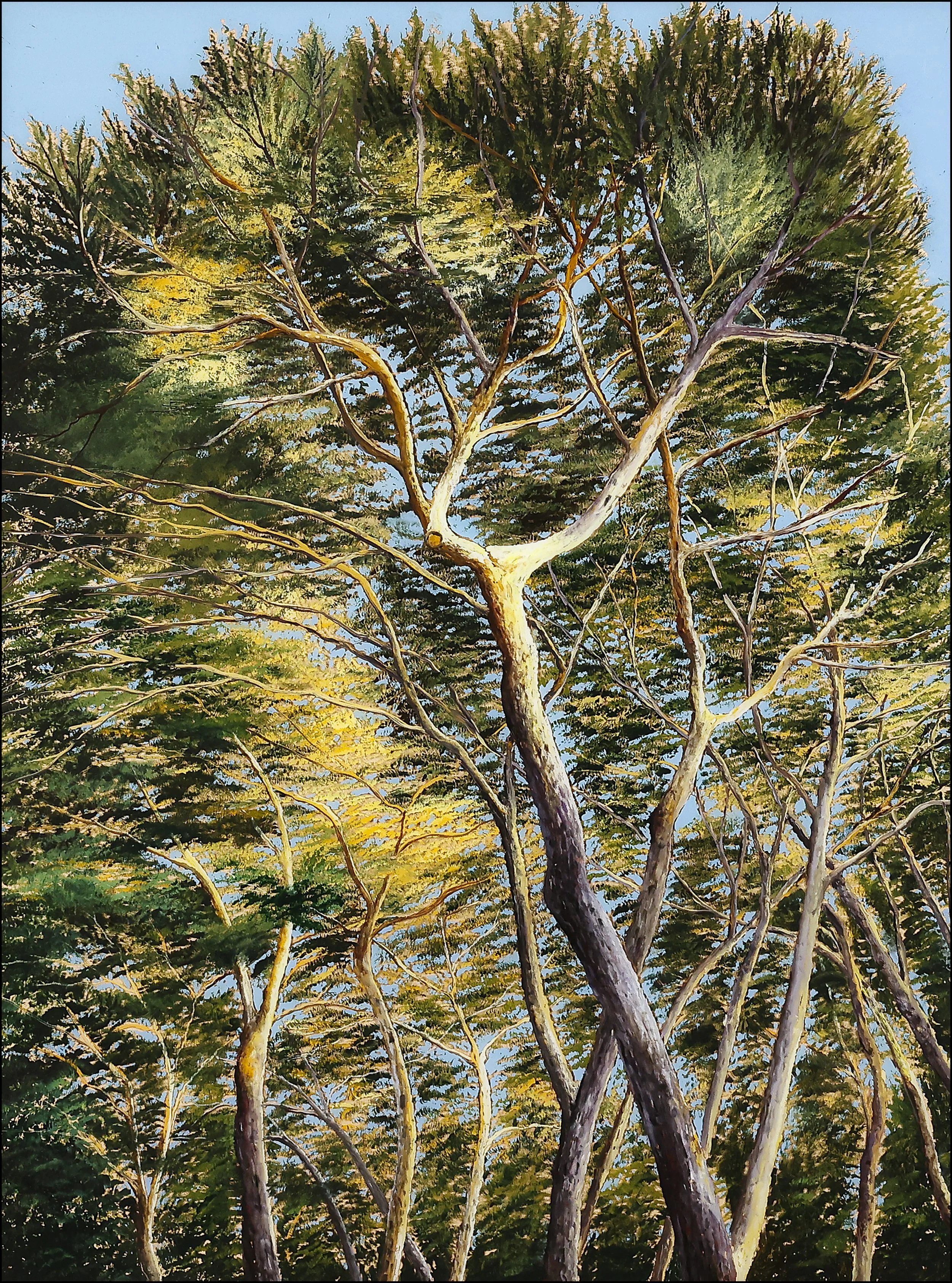 Geneviève Garcia-Gallo, Les pins flamboyants, huile sur verre (fixé sur verre), 80×60 cm