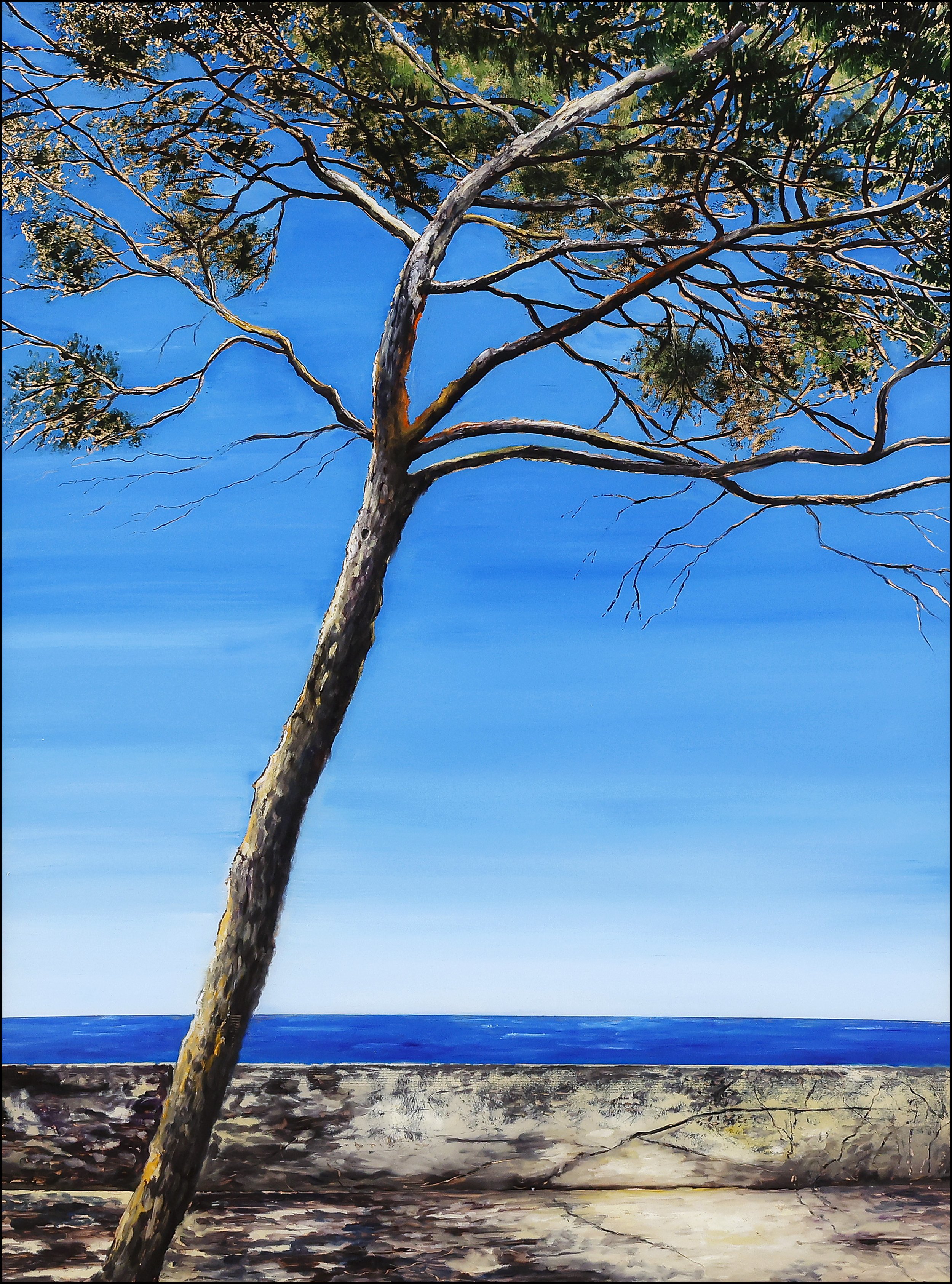 Alchimie du bleu des horizons et des ors de la lumière sous son pinceau ! De leur fusion renaissent les chemins de son enfance dont le souvenir butte sur les piques d’un cactus, s’enivre d’une grappe de mimosa ou d’eucalyptus, se gonfle de toutes les sèves avant de se perdre dans le bleu du ciel ou de la mer, indistinctement, infiniment…